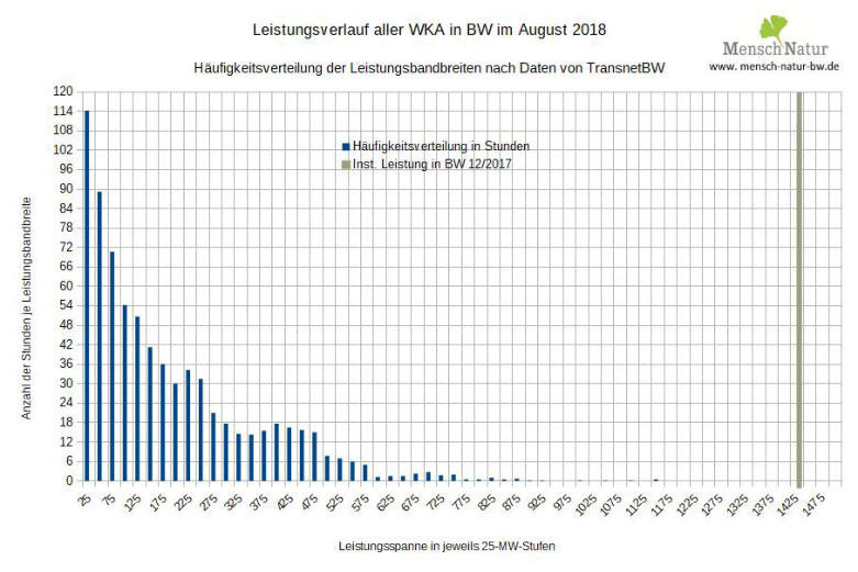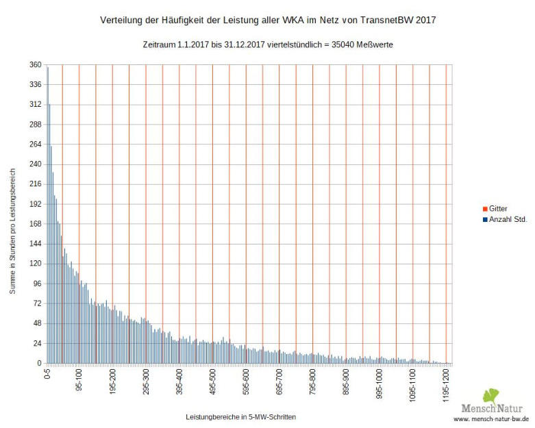 Abbildung 3: Häufigkeitsverteilung der Leistung aus Windkraftanlagen in Baden Württemberg 2017