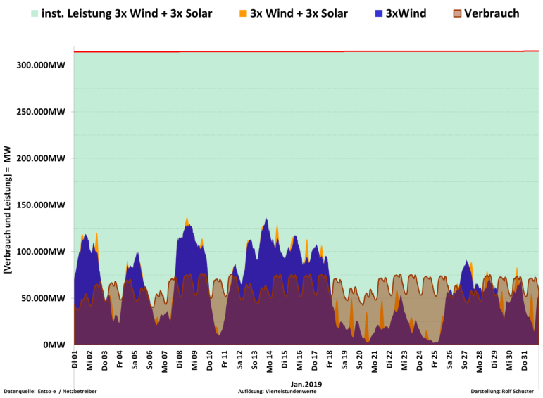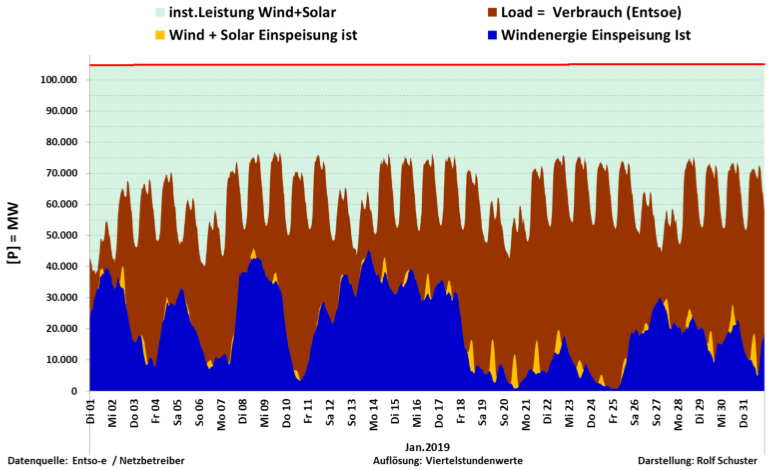 Einspeiseleistung aus Wind und Sonne haben wir den Wintermonat Januar in 2019 ausgesucht. Aktuell liefern die Daten der